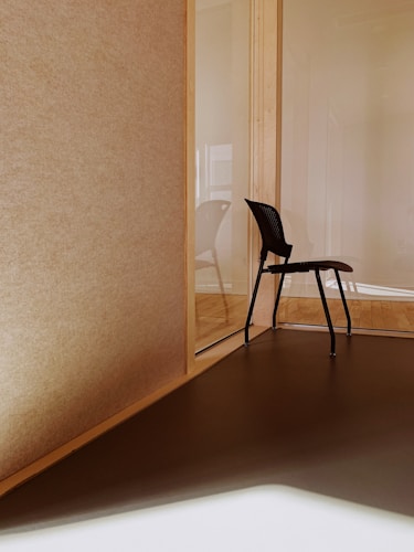 A quiet corner designed for relaxation, featuring soft textures and a minimalist palette of black and light brown.